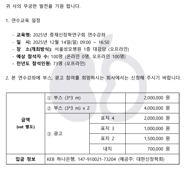 공문(중재신장학연구회 연수강좌 부스 및 광고 참여 신청 안내
