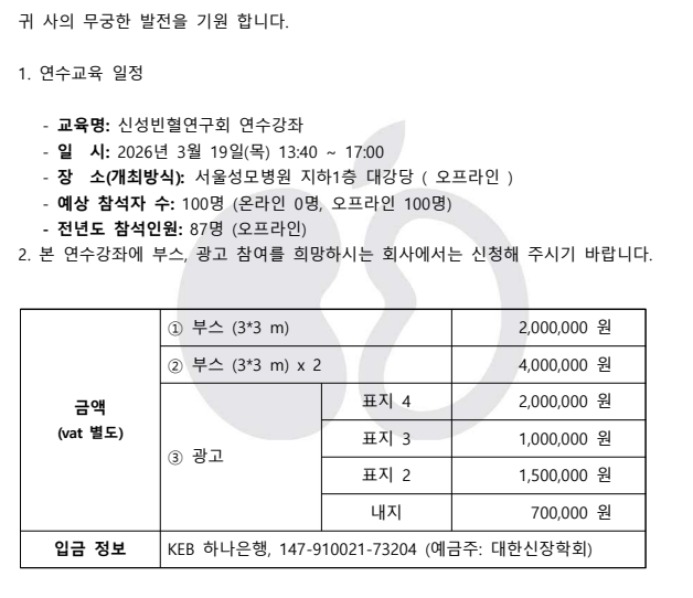 공문(신성빈혈연구회 연수강좌 연수강좌 부스 및 광고 참여 신청 안내